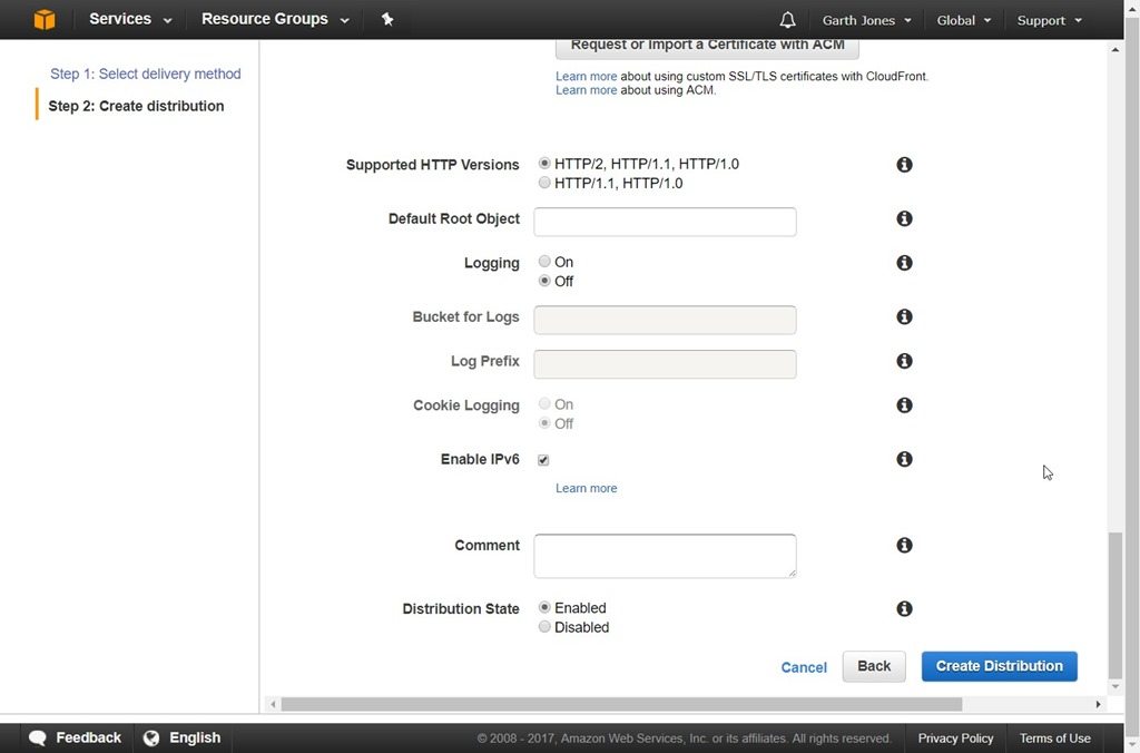 Next, scroll down to the bottom of the page and click on the Create Distribution button. Doing so will return you to CloudFront Distributions.![]()