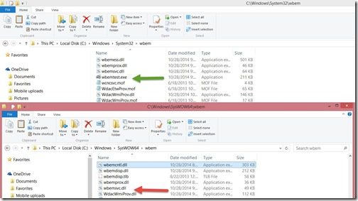 Notice within the screenshot below that wbemtest.exe does NOT exist in c:\windows\syswow64\wbem directory (red arrow) but it does exist within the c:\windows\system32\wbem (green arrow).